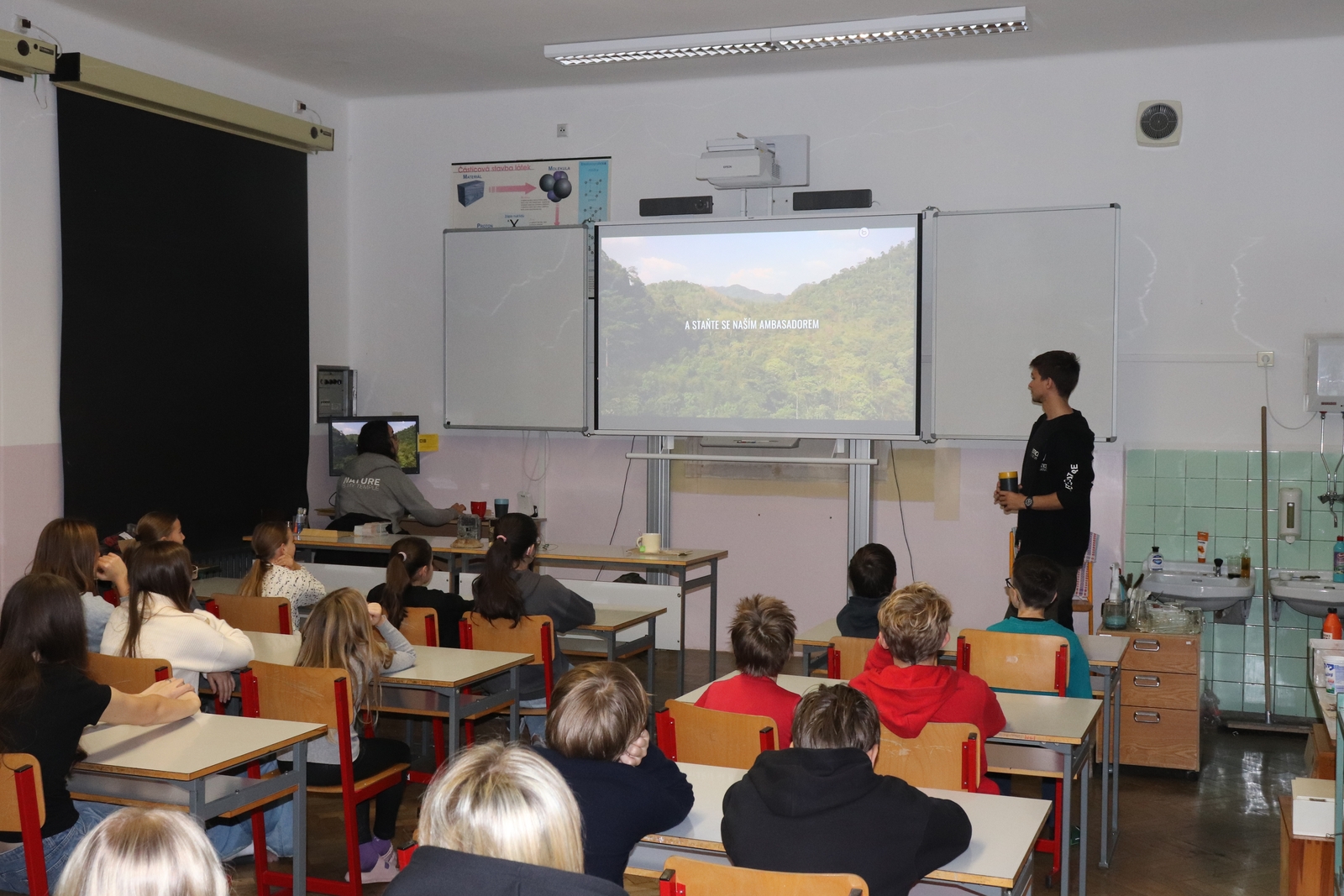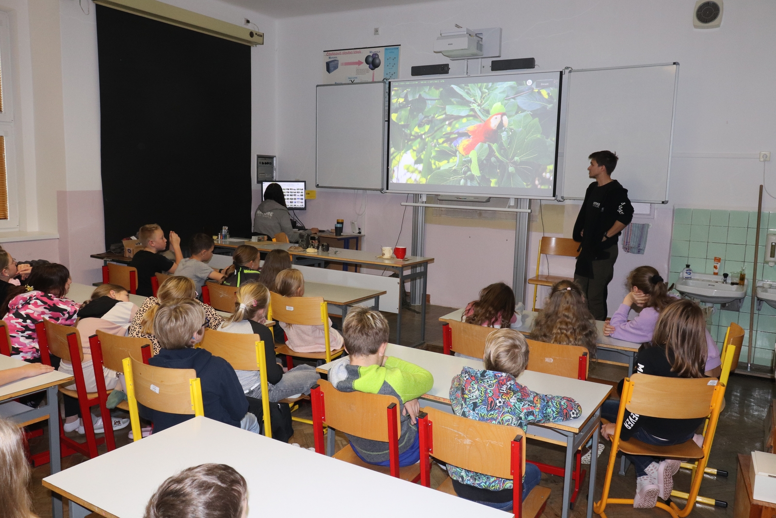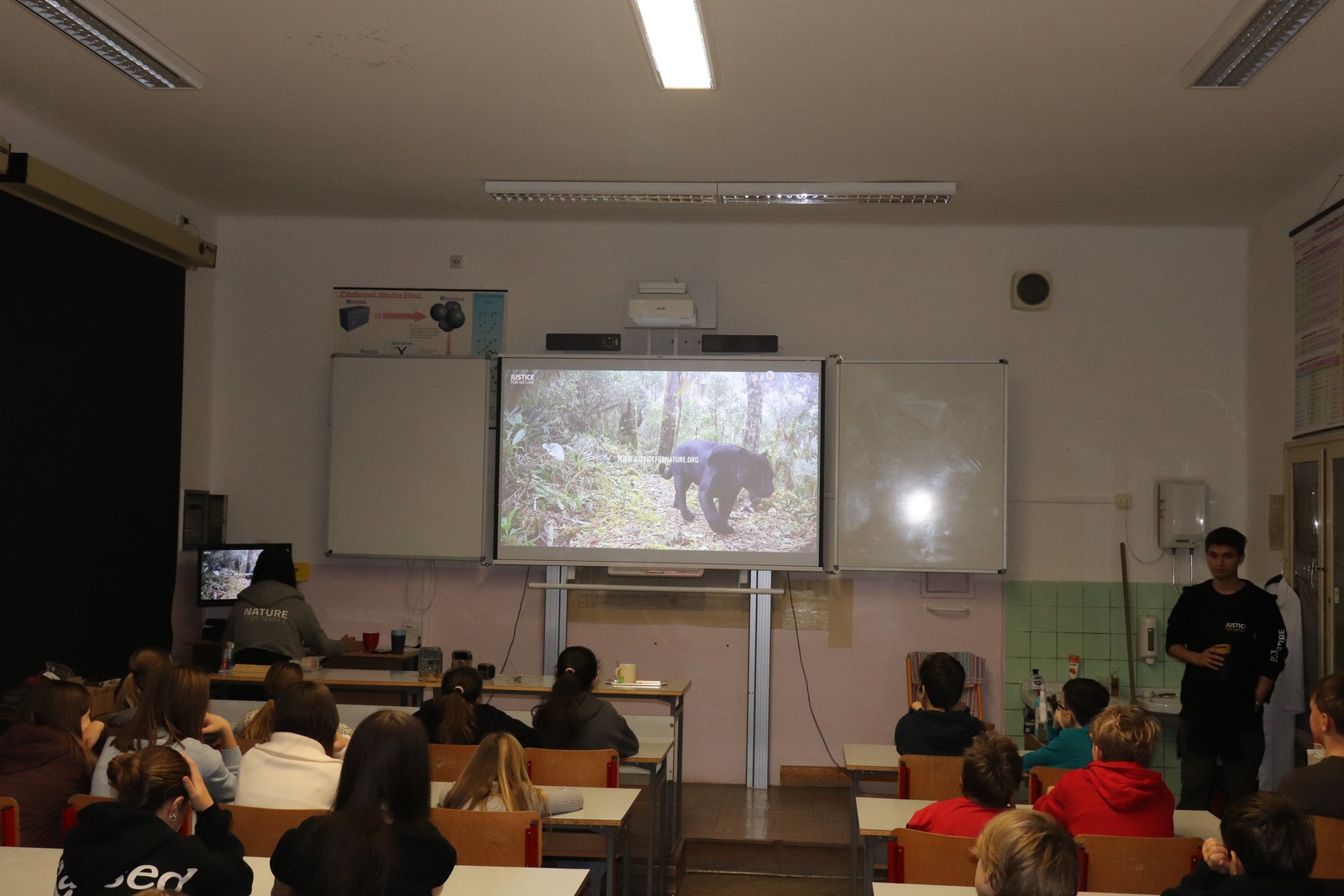 (24. října), která se zaměřila mimo jiné na deštné pralesy, ale přednášející Jan Suchý se neomezil jen na toto téma a žákům pověděl i o dalších projektech, kterými se nezisková organizace Justice for Nature zabývá. Jedná se o monitorovací programy Oko tygra, Oko země, Oko jaguára, z nichž některé trvají již dvanáct let a za tu dobu se díky jejich snaze podařilo zadržet a odhalit desítky až stovky nelegálních pytláků a ochránit tak drahocennou faunu naší planety.